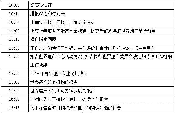 7月1日,大会开始各项议程,就观察员认证,议程和时间表,上届会议情况报告,上年度世界遗产基金会决算和新的双年度世界遗产基金预算,操作指南回顾,工作方法和特设工作组成果的评估和审计的后续建议(项目启动),世界遗产中心活动情况报告,执行世界遗产委员会决定的特色工作组的工作成果报告,世界遗产咨询机构报告,世界遗产公约和可持续发展报告,非洲优先、可持续发展和世界遗产报告,以及关于加强咨询机构和缔约国间沟通对话的报告进行了通报和审议,并举行2019年青年遗产专业论坛致辞等活动。
