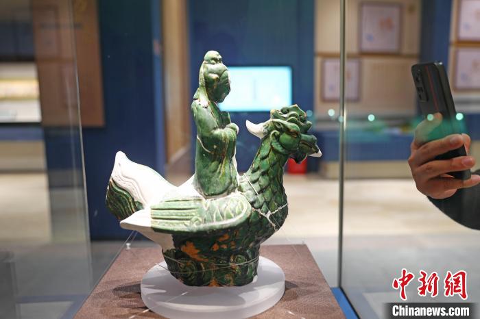 11月19日上午,游客用手机拍摄江西龙虎山大上清宫遗址出土的文物《绿釉骑凤仙人》。中新社记者 刘占昆 摄