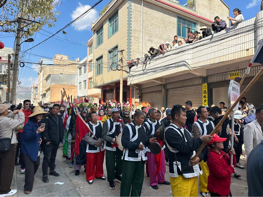按照当地民俗传统,当天由国家级非物质文化遗产代表性项目关索戏打头阵,新街村、阳宗村、北斗村的代表队在北斗村与新街村的交汇处汇集,迎接两柱高大的“大香”,大香高达数米,由村民手工制作,香体上绘有吉祥图案和祝福语,象征着人民对美好生活的向往。各村文艺队紧随其后,载歌载舞,将大香护送至龙泉寺,充满了浓厚的节日氛围。
